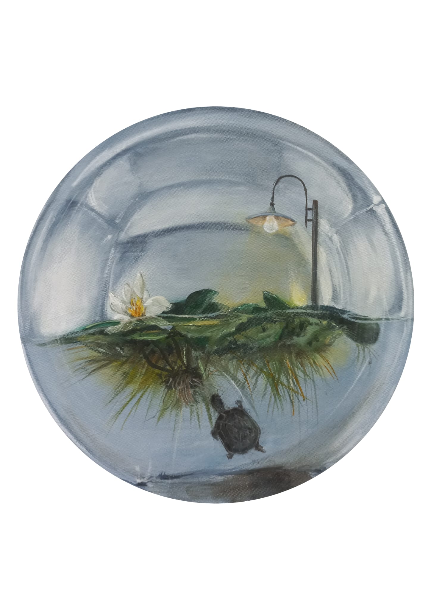 Cette petite toile de 20 cm de diamètre, n’est autre qu’un bocal, un mini-aquarium. À l’intérieur, une plante, fragile et lumineuse, qui semble pousser sous un lampadaire imaginaire. Ma tortue, fidèle symbole du monde et de longévité, veille sur cet univers miniature. C’est un petit monde suspendu, où chaque élément raconte capte un peu de magie de la nature.
