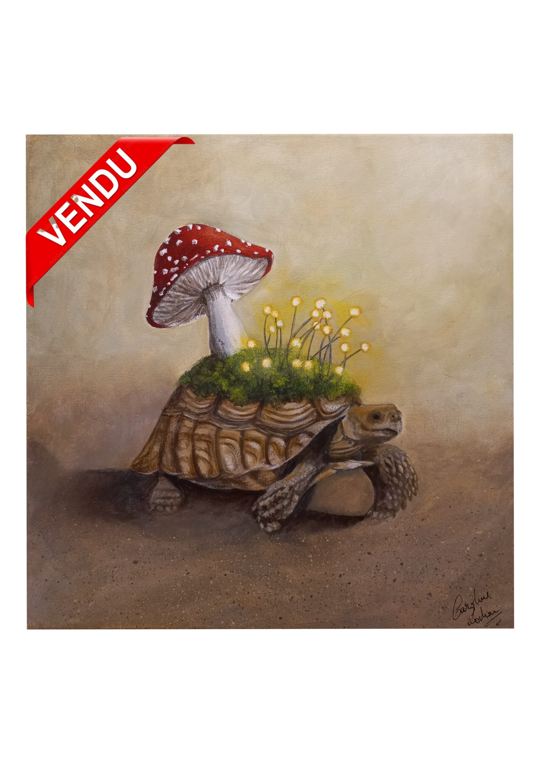 Cette peinture acrylique sur toile représente symboliquement une tortue portant sur son dos un tapis de pelouse, un champignon et des plantes lucioles.