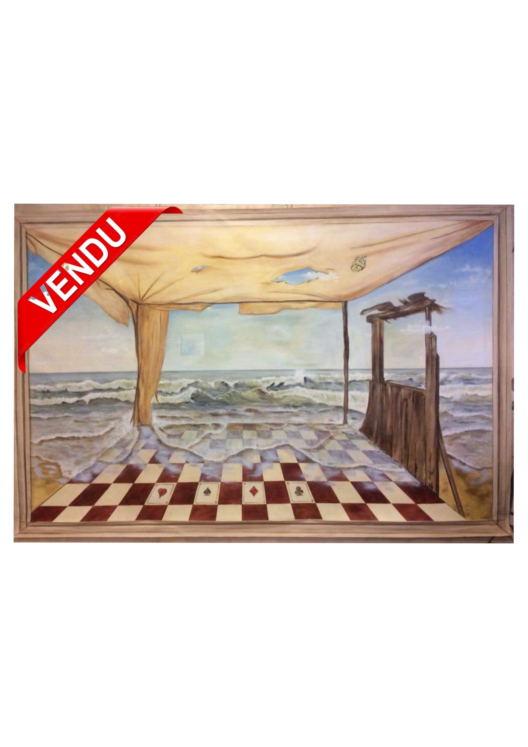 Cette peinture à l’acrylique est un ensemble de symbole, jeu de carte, damier, mer, porte vétuste, barnum et ouverture dans le ciel. La protection, les enjeux, le passé, les émotions font de cette oeuvre une thématique psychologique qui a trouvé parfaitement sa place chez un spécialiste.