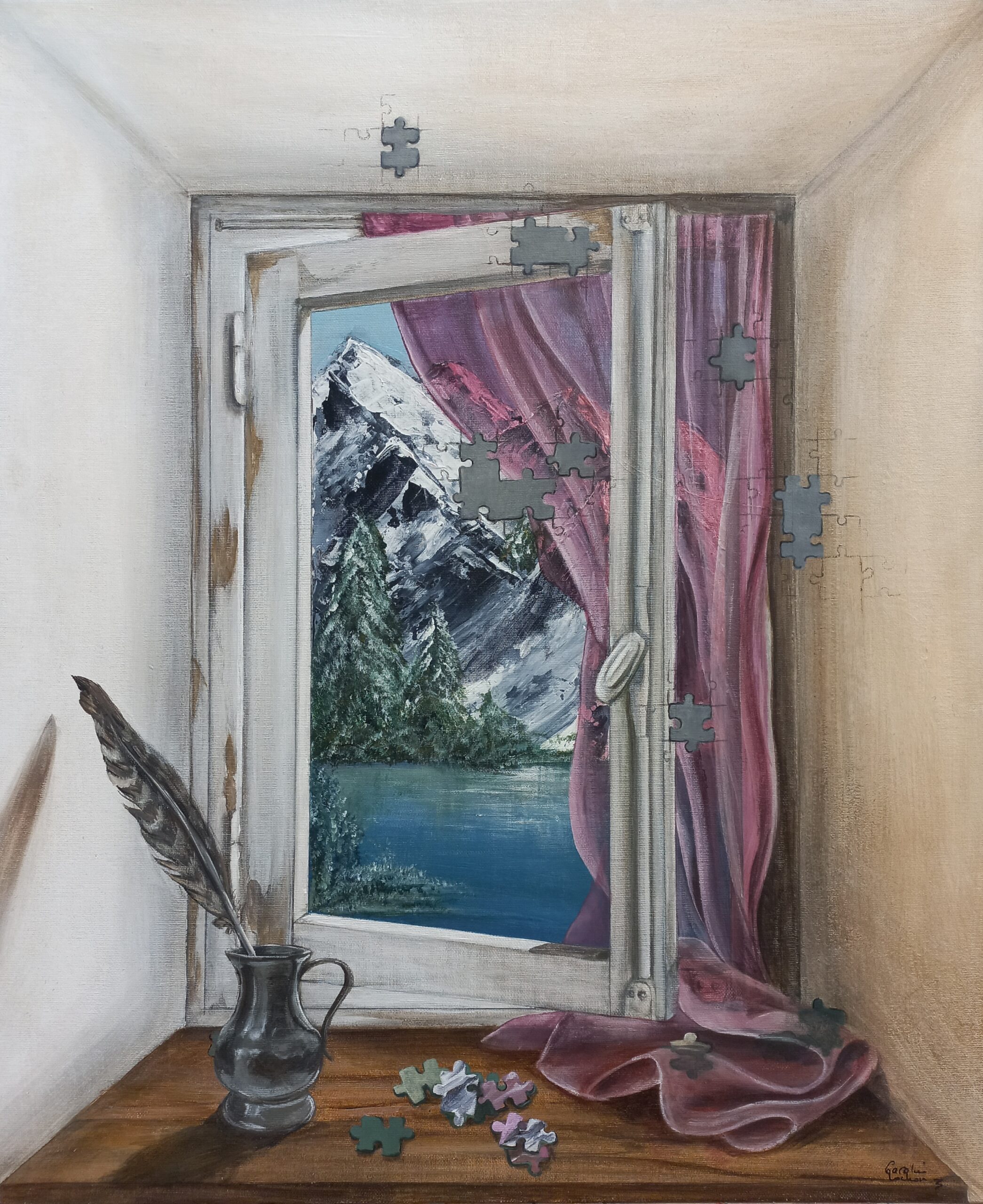 La toile suggère un puzzle dont les pièces se détachent, tombant doucement sur la planche du tableau.