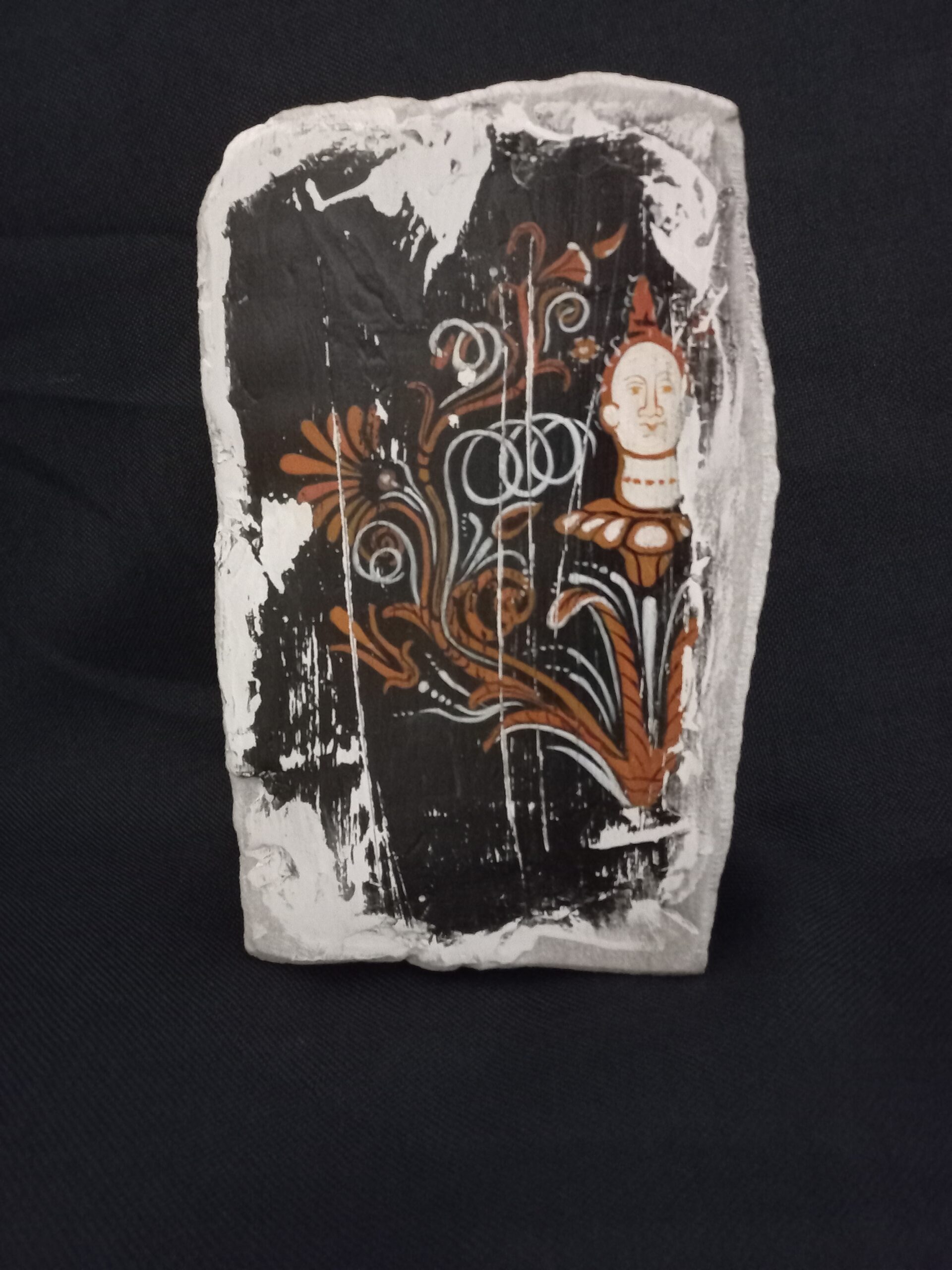 Sur un bloc de pierre, j’ai peint les motifs en leur donnant l’aspect du temps, les vieillissant comme un fragment d’histoire retrouvé.